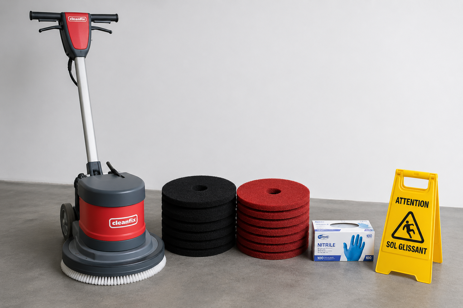 Ce pack réunit l’équipement indispensable pour traiter efficacement les sols, avec une monobrosse basse vitesse Cleanfix, des disques adaptés aux principales étapes d’intervention, ainsi que des accessoires de protection et de sécurité.